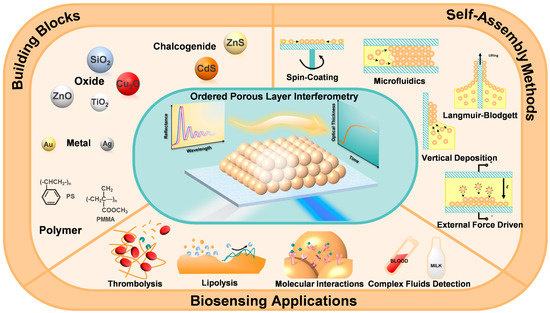 In recent years, many reviews related to self-assembly have summarized the types of materials, fabrication methods, and traditional optical applications [8,16]. There are also interferometric sensor-related reviews summarizing and comparing the applications of different classes of interferometric sensors [1,2]. This is the first comprehensive review of the use of ordered porous CCs in the field of interferometry. From the perspective of self-assembled materials, this review will introduce various building blocks used for CCs’ self-assembly, summarize their self-assembly methods, and discuss the advantages and disadvantages of each method. The versatile biosensing applications are achievable through the combination of self-assembled colloidal crystals as porous interference substrates with reflectometric interferometry, which is called ordered porous layer interferometry (OPLI) (see Figure 1). Finally, we will provide a comprehensive overview of the benefits and drawbacks associated with utilizing ordered porous films in reflectometric interferometry, as well as outline potential avenues for its future development.