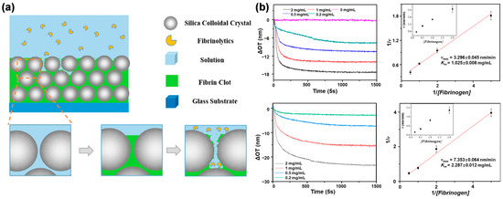 Wu et al. constructed the fibrin layer on silica CCs films as the thrombolysis analysis model for drug tests [95]. (Figure 5) The fibrin gel layer was prepared in a reaction cell on the silica CCs film by polymerization of fibrinogen with thrombin. After the removal of redundant gel on the film surface, the fibrin-loaded silica CCs film still presented good Fabry-Pérot fringes in the spectrum, and the formation of fibrin was proved by the energy dispersive spectrometer (EDS) analysis. The fibrin-loaded silica CCs films were degraded by nattokinase and urokinase, and the whole process was monitored by the OPLI system in real-time. The Michaelis-Menten equation was carried out on the kinetic results of two thrombolysis drugs to obtain the Michaelis constant (Km), referred to as their thrombolytic efficacy. Compared to the traditional fibrin plate method, this model provides a valuable tool for real-time investigation of fibrinolysis and further comprehension of its role in both health and disease.