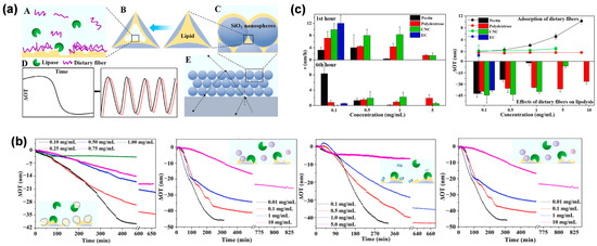 The real-time monitoring of lipolysis through OPLI. (a) Diagram of lipid-dietary fiber-lipase interaction on CCs films analyzed by interferometry. (b,c) Real-time lipolysis process and kinetics influenced by several dietary fibers. Reproduced with permission from [91]. Copyright (2021) Elsevier B.V.