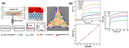 The colored fluids were difficult to detect directly on the pSi or AAO sensors. Nevertheless, the transparency property of CC films allows spectrum acquisition from the back, avoiding disturbances from complex samples. Su et al. prepared SPA-functionalized silica CCs films for human immunoglobulin G (hIgG) content detection in whole blood [101]. (Figure 8) The SPA-functionalized silica CCs films were blocked by high-concentration bovine serum albumin (BSA) and 0.02% tween-20 and showed a good performance on anti-nonspecific adsorption. The silica CCs films effectively prevent the entry of large impurities such as blood cells, while the presence of BSA on the surface reduces their adhesion. The hIgG content results obtained from OPLI were highly comparable to those of the immunoturbidimetric assay. This approach can be further applied to the quantification of hIgG concentration in milk and the maintenance of a long storage time of sensors by sucrose protection, which would play an important role in the innovation of novel dairy products [100,102].