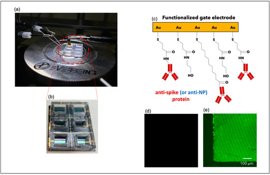 The quality of the biofunctionalization protocol was tested (Section 3.1 with Figure 1 andFigure S1) by immersing gate electrodes in a solution with secondary antibodies conjugated to Alexa Fluor® 488 dye (donkey anti-rabbit—Alexa Fluor 488 at dilution of 1:200, purchased by Thermofisher, Waltham, MA, USA) for 1 h at room temperature. Then, the samples were observed with confocal laser scanning microscopy (CLSM—Zeiss LSM5 Pascal) technique to assess the binding between the primary and secondary antibodies. Moreover, gate electrodes functionalized with anti-spike antibodies were analyzed by Fourier Transform Infrared Spectroscopy (FTIR) techniques. The latter was performed using Agilent Cary 630 FTIR (Agilent Technologies, Inc., Santa Clara, CA, USA), working with an ATR module in the range between 4000 and 650 nm. Before any FTIR spectrum acquisition, the samples were carefully dried on a very thin N2 flow for 5′ to reduce the moisture. During the analysis, more than 10 spectra were collected to find the best working conditions, i.e., environmental parameters, number of scans, resolution, overall instrument working energy and to perform several comparisons with different backgrounds.