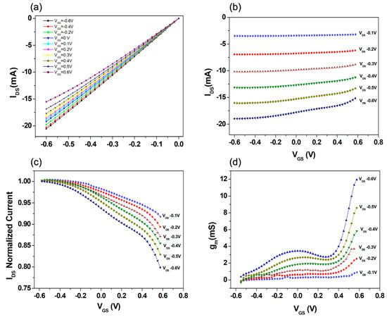 Figure 2b shows a set of transfer curves recorded at different VDS, while, in Figure 2c, the same curves are represented as normalized with respect to the IDS value measured at VGS = −0.6 V. Finally, Figure 2d reports the corresponding transconductance (gm) values (gm = δIDS/δVGS).