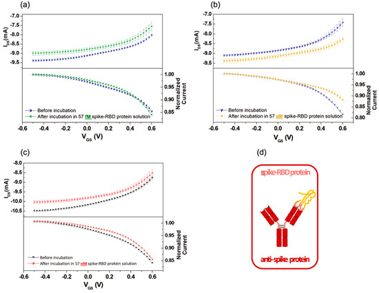 Transfer curves (top panels) and normalized transfer curves with respect to the IDS current recorded at VGS = −0.5 V (bottom panels) measured as a function of VGS by using a functionalized gate with anti-spike protein before incubation and after incubation in solutions with (a) 57 femtomolar (fM) spike-RBD protein; (b) 57 picomolar (pM) spike-RBD protein; (c) 57 nanomolar (nM) spike-RBD protein; (d) cartoon reporting the spike antibody–antigen binding event.