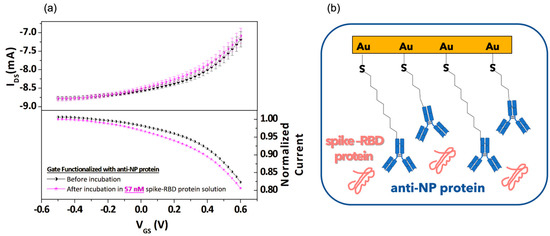 (a) Transfer curves (top panel) and normalized transfer curves with respect to the IDS current recorded at VGS = −0.5 V (bottom panel) as a function of VGS by using a functionalized gate with nucleocapside (NP) antibody before and after incubation in 57 nanomolar spike-RBD protein solution; (b) cartoon of the anti-NP protein and spike-RBD protein unbound configuration.
