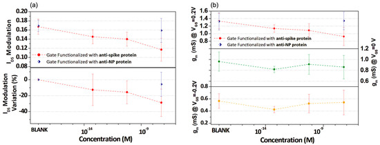 Moreover, in the graphs of Figure 5a,b (top panel), the IDS modulation and transconductance at VGS = +0.2 V values obtained for the experiments carried out with anti-NP protein functionalized gate electrode before and after incubation in a solution with 57 nM of spike-RBD protein are also included. In this case, because of the lack of a antigen–antibody complex, the IDS modulation and gm values before and after the incubation are completely indistinguishable.