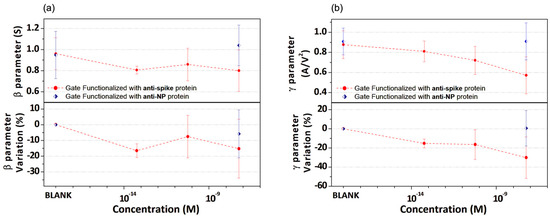 Hence, the values of the β and γ fitting parameters averaged for all the experiments performed at different spike-RBD protein concentrations are plotted in Figure 6a,b, respectively. In particular, while resembling the behavior of gm at VGS = 0 and −0.2 V, even if the β fitting parameter (Figure 6a) is significantly reduced in the lowest concentration (i.e., fM) range in comparison with the BLANK test (i.e., prior to any incubation step [36]), it does not exhibit a regular dependence on the spike-RBD protein concentration, particularly for the values in the pico- and nano-molar ranges. Conversely, the γ fitting parameter quite satisfactorily reproduces the behavior achieved for the gm value estimated at the single VGS = 0.2 V, displaying a monotonously decaying behavior as a function of the spike-RBD protein concentration for the anti-spike protein functionalized gate electrode. In this case, no significant variations were observed before and after incubation in a solution with 57 nM of spike-RBD protein solution when a gate functionalized with anti-NP protein was employed. Hence, this approach confirms that the VGS region in which IDS shows a square dependence on VGS is the most sensitive to the changes produced by the gate incubation process. It should be outlined that the progressive occurrence of the gm reduction in the OECT response, as a consequence of a protein detection at the gate/electrolyte interface, has been reported in other works, confirming that transconductance behavior is strictly related to the specific VGS region [25]. This feature points to the need for alternative theoretical frameworks that can provide more insightful descriptions of the OECT electrical behavior [39,40].