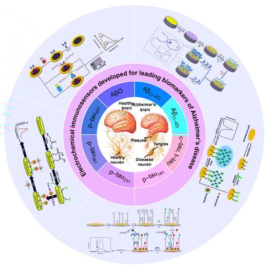 Various diagnostic methods, including electrochemical, electrical, mechanical, and optical techniques, have been investigated over time for AD. These methods aim to identify specific biomarkers associated with AD to facilitate early diagnosis and management of the disease. However, each method has its advantages and limitations. Electrochemical biosensors have shown great potential as a future diagnostic tool for AD due to their high sensitivity, simple production process, easy handling, portability, and low cost. Despite this potential, integrating these methods into clinical practice and diagnostic protocols is necessary to ensure their widespread use and effectiveness in AD management. Therefore, further research is needed to optimize electrochemical biosensors’ performance and establish their role in AD diagnosis. This review presented a comprehensive summary of the essential features and electrochemical performance of developed immunosensing platforms. The information encompasses electrode materials, nanomaterials or other signal amplifiers, biofunctionalization methods, and primary electrochemical sensing performance parameters, such as sensitivity, linear detection range, LOD, and clinical application. To sustain the growth momentum to develop diagnostic devices, it is necessary to overcome the challenges that must be addressed.