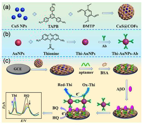 - Chen, Y.; Wang, S.; Ren, J.; Zhao, H.; Cui, M.; Li, N.; Li, M.; Zhang, C. Electrocatalysis of Copper Sulfide Nanoparticle-Engineered Covalent Organic Frameworks for Ratiometric Electrochemical Detection of Amyloid-β Oligomer. Anal. Chem. 2022, 94, 11201–11208. [Google Scholar] [CrossRef]