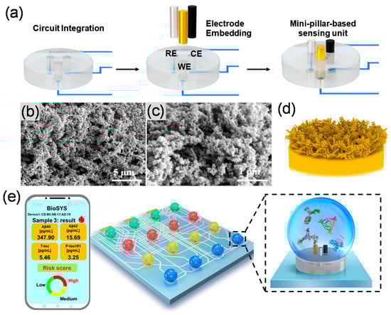 Schematic illustration of a mini-pillar-based portable electrochemical sensing platform for the detection of multiple AD biomarkers (a); SEM micrographs of the Au nanostructure (b,c); schematic architecture of the electrode surface modified with the Au nanostructure (d); and the portable platform for detection of multiple AD biomarkers (Aβ(1-40), Aβ(1-42), and p-tau181) (e). Reprinted from [79] with permission from Springer Nature.