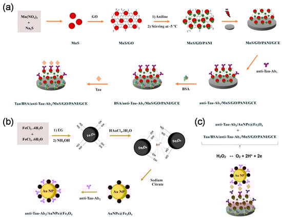 In another study, Yola et al., 2022, developed an immunosensor for the tau protein using manganese sulfide nanoparticles/graphene oxide/polyaniline (MnS/GO/polyaniline (PANI)) and magnetite-decorated Au nanoparticles (Fe3O4/AuNPs) as a signal amplifier [101]. To synthesize MnS/GO/PANI nanocomposite, a manganese nitrate (Mn(NO3)2) solution dissolved in the DI water was slowly mixed with the Na2S solution at 25 °C for 60 min, followed by adding GO (synthesized via the modified Hummers’ method). The final dark brown precipitate (MnS/GO) resulted in the growth of MnS NPs (diameter: 20–25 nm) on the GO sheet. The synthesized (MnS/GO) was then slowly mixed with aniline and ammonium persulphate ((NH4)2S2O8) and kept at −5 °C for 4 h to produce the homogeneous suspension. The final product (MnS/GO/PANI) was washed with methanol and DI water (Figure 4a). The MnS-GO nanocomposite contained many active sites suitable to enhance the nucleation reaction for the polymerization of aniline molecules. These aniline molecules were electrostatically reacted with functional groups (-COOH and -OH) of GO, and these aniline molecules used to be polymerized on the MnS-GO nanocomposite surface. Therefore, the MnS-GO-PANI nanocomposite showed high stability through an effective electrostatic interaction of MnS NPs and GO and a covalent interaction related to the MnS-GO and PANI. For the synthesis of the AuNPs@Fe3O4/anti-tau-Ab2 conjugated form, the mixtures of FeCl2·4H2O and FeCl3·6H2O were dissolved in a solution of ethylene glycol and DI water at 70 °C under continuous stirring, followed by slowly adding the NH4OH. The Fe3O4NPs (diameter: 10–15 nm) were obtained after washing with DI water. Afterward, the HAuCl4·3H2O and ethylene glycol mixture was added to the Fe3O4NPs solution under stirring at 90 °C for 5 min. Then, the achieved mixture was added to the sodium citrate solution under further stirring for 30 min to reach the AuNPs-Fe3O4 nanocomposite. The anti-tau-Ab2 was incubated with the AuNPs-Fe3O4 nanocomposite to have AuNPs/Fe3O4-anti-tau-Ab2 conjugated form (Figure 4b). To produce the immunosensor, MnS-GO-PANI nanocomposite solution was drop-casted onto a GCE surface and dried under an infrared heat lamp for 30 min, followed by immobilization of anti-tau-Ab1, strongly attached via stable electrostatic/ionic interactions. Then, various concentrations of the analyte were added to the surface of the final electrode (GCE/PANI/GO/MnS/anti-tau-Ab1). As the last step, the AuNPs/Fe3O4/anti-tau-Ab2 conjugated form was immobilized as the signal amplifier (Figure 4c). The electrochemical assay demonstrated that DPV signals increased with increasing the tau protein concentrations in a linear range from 1 × 10−13 to 1 × 10−6 M, with a LOD of 1 × 10−14 M. The presented sandwich-like immunosensing platform exhibited high sensitivity and a linear relationship with tau protein due to its special assembly and the presence of AuNPs (diameter: ~68–75 nm) and Fe3O4 NPs (diameter: ~10–15 nm), which provided a high surface area, rapid electron transfer, and a strong synergistic effect. This resulted in the enhancement of the electrochemical activity.