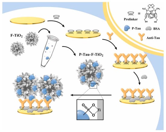 Schematic illustration of the flower-shaped TiO2-based electrochemical immunosensor for detecting p-tau protein. Reprinted from [31] with permission from Elsevier.