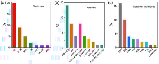 Electrochemical techniques such as voltammetry, impedance spectroscopy, and amperometry have greatly interested researchers for the purpose of detecting AD biomarkers. Figure 6c shows that DPV is the most commonly used electrochemical technique (16%) for detecting AD biomarkers mainly due to its high sensitivity. This technique is particularly useful for detecting low concentrations of analytes in complex biological matrices such as blood or CSF. In recent studies, EIS is another commonly used electrochemical detection technique (10%) for AD. EIS is particularly useful for detecting changes in interfacial properties, a promising technique for the electrochemical characterization of immunosensors for the early diagnosis of AD.