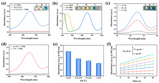 UV-vis spectra of (a) various reaction systems, (b) Co-N-C catalyzed oxidation of ABTS, OPD, and TMB, (c) Co-N-C oxidizing TMB under N2, Air and O2 saturation conditions, and (d) Co-N-C and N-C. (e) Changes of UV-vis absorbance intensities of Co-N-C + TMB solution after the addition of different concentrations of SCN−. (f) Concentration optimization of Co-N-C, (The colored lines represent the concentration of the nanozyme, in order of 0, 2.5, 5.0, 7.5, 10, 12.5, and 15 μg mL−1). Error bars represent the standard deviation of three parallel measurements.