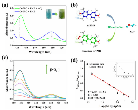 (a) Effect of NO2− on the UV-vis absorption signal; (b) Schematic diagram of diazotization of nitrite with oxTMB; (c) UV-vis spectra of Co-N-C + TMB + NO2− with NO2− at various levels, (The colored lines represent the concentration of NO2−, in order of 20, 40, 60, 80, 100, 150, and 200 μM); (d) Linear relationship between the value of A652/A445 and the value of Log([NO2−]).