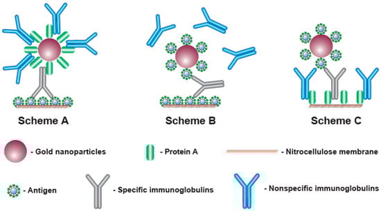 To detect antibodies, different formats of LFIA can be implemented that differ in the components of the detected complex and the order of their assembly. The most known approach is to apply an antigen of a given pathogen to the analytical zone, while complexes with an immunoglobulin-binding protein (such as anti-species antibodies, bacterial proteins A, G, L, etc. [,,]) immobilized on a nanoparticle are formed in the fluid flowing along the test strip (Scheme A, see Figure 1, A). However, immunoglobulin-binding proteins interact with all immunoglobulins in the sample, not just with specific antibodies against the given antigen. Considering that specific antibodies to a certain antigen are a small part (a few percent or fractions of a percent) of all immunoglobulins, most of the immunoglobulin-binding proteins are blocked by non-specific immunoglobulins. This blocking reduces the binding of the label in the analytical zone and makes reliable serodiagnostics difficult at low contents of specific antibodies [,]. The use of additional stages of the assay to enhance the recorded signal is possible [,], but it deprives LFIA of its main advantages in rapidity and easy implementation.
