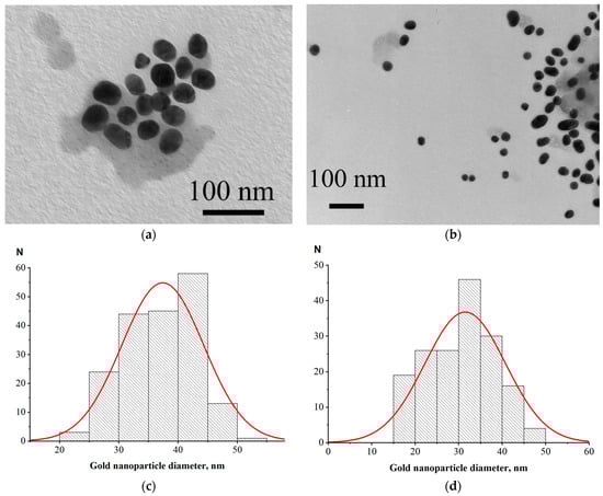 For LFIA according to Scheme A, we used a commercial protein A–GNPs preparation with a declared average nanoparticle diameter of 30 nm. For Schemes B and C, we synthesized GNPs of close size and conjugated them to the RBD antigen. Examples of electron micrographs and histograms of conjugate nanoparticles distributions by diameter (that were built based on microscopy data) are shown in Figure 2. The average nanoparticle diameters were 37 ± 6 nm for RBD–GNPs and 32 ± 9 nm for protein A–GNPs.