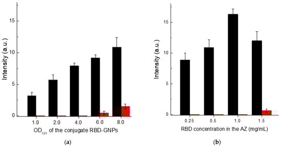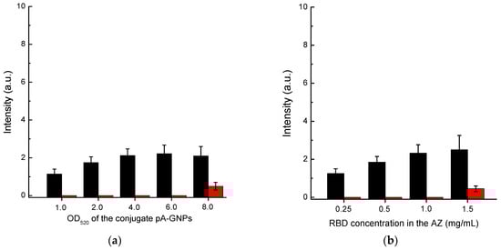 Comparison of conditions for Scheme B of SARS-CoV-2 serodiagnosis: (a) choice of OD520 for RBD–GNPs conjugate at RBD concentration applied to AZ of 0.5 mg/mL; and (b) choice of RBD concentration loaded to AZ at OD520 of RBD–GNPs conjugate of 5.0. The red bars in (a,b) correspond to the 30-fold diluted pooled negative serum, and the black bars correspond to the same diluted serum with added ABRBD5324 antibody at a concentration of 5 µg/mL.