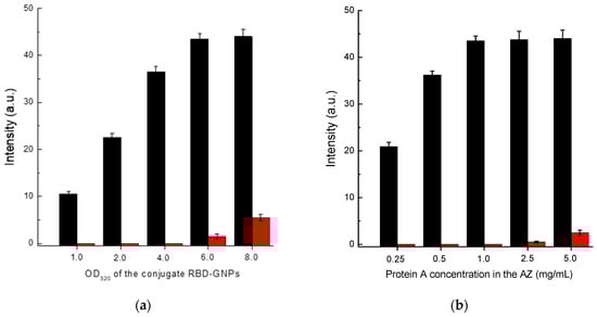 Comparison of conditions for Scheme C of SARS-CoV-2 serodiagnosis: (a) choice of OD520 for RBD–GNPs conjugate at protein A concentration applied to AZ of 0.5 mg/mL; and (b) choice of protein A concentration loaded to AZ at OD520 of RBD–GNPs conjugate of 5.0. The red bars in (a,b) correspond to the 30-fold diluted pooled negative serum, and the black bars correspond to the same diluted serum with added ABRBD5324 antibody at a concentration of 5 µg/mL.