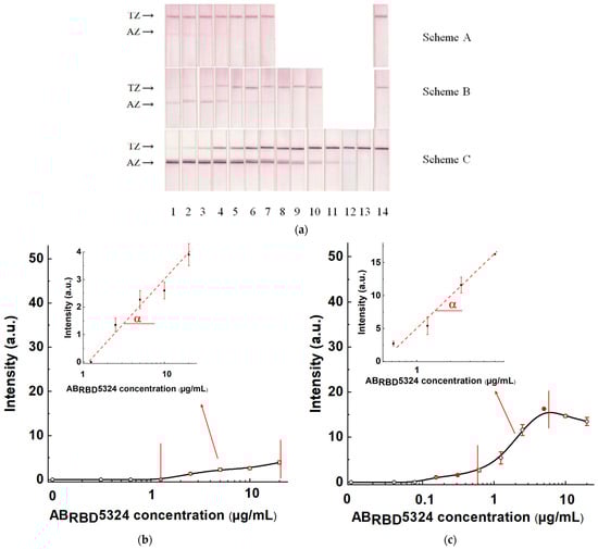 LFIAs of the ABRBD5324 antibodies added to the 30-fold diluted pooled negative serum. (a) The appearance of test strips after analysis. The ABRBD5324 concentrations are 20 (1), 10 (2), 5.0 (3), 2.5 (4), 1.25 (5), 0.62 (6), 0.31 (7), 0.155 (8), 0.078 (9), 0.04 (10), 0.02 (11), 0.01 (12), 0.005 (13) and 0 (14) µg/mL. (b–d) Calibration curves of Schemes A, B and C, respectively (with added zooms of their working ranges and the indicated slope α).