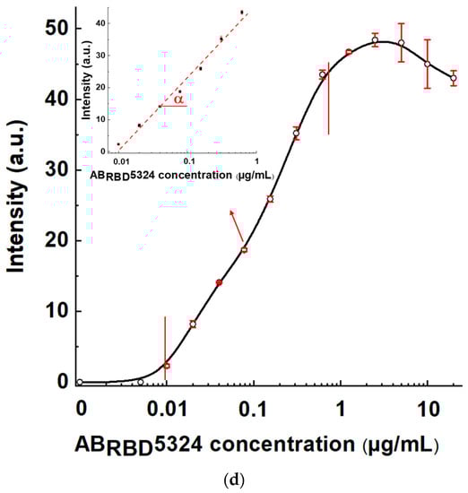 For Scheme A, the LOD of antibodies in serum was 2.5 μg/mL, and the maximal reached signal was 4.4 arb. units. For Scheme B, these parameters were 0.155 μg/mL and 16 arb. units, respectively, and for Scheme C—0.01 µg/mL and 48 arb. units, respectively. That is, Scheme A was identified as the the least effective, and Scheme C as the most effective.