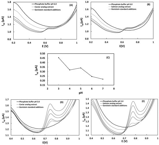Influence of pH on the quantification of isoflavones. (A) Differential pulse voltammograms of caviar analog extract (70% ethanol) with standard additions of genistein 1.0 × 10−3 mol L−1 in pH 6.0. (B) Differential pulse voltammograms of salmon analog extract (70% ethanol) with standard additions of genistein 1.0 × 10−3 mol L−1 in pH 6.0. (C) Oxidation (anodic) peak current (Iap/µA) intensities of genistein standard 1.0 × 10−3 mol L−1 with different pHs. (D) Differential pulse voltammograms of caviar analog extract (70% ethanol) with standard additions of genistein 1.0 × 10−3 mol L−1 in pH 3.0. (E) Differential pulse voltammograms of salmon analog extract (70% ethanol) with standard additions of genistein 1.0 × 10−3 mol L−1 in pH 3.0.