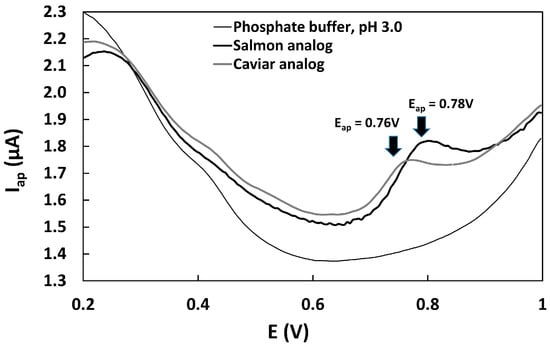Differential pulse voltammograms of caviar analog and salmon analog extracts (in 70% ethanol) in phosphate buffer at pH 3.0.