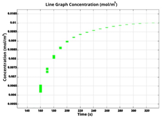 Specifically, in COMSOL Multiphysics, we calculate the filling time through monitoring the concentration of water at the outlet boundary. Figure 4 depicts water concentration at the outlet versus time for the liver-on-a-chip with a circular chamber. The initial water concentration at the outlet is obviously zero, subsequently increasing until it reaches a steady state with a constant value equal to the inlet water concentration. This indicates that the chip was completely filled and the flow has been stabilized.