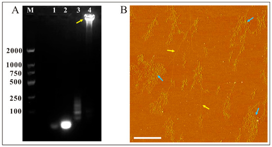 (A): Agarose gel electrophoresis results of the RCA product. M: DNA marker; 1: primer-1; 2: phosphorylated linear DNA-1 (PL-DNA-1); 3: circular DNA template-1 (CT-1); 4: RCA products (ssDNA-1). (B): AFM phase image of RCA products. Yellow arrows indicate single-stranded DNA and blue arrows indicate nanostructures by DNA random coiling. The scale bar represents 1 μm.