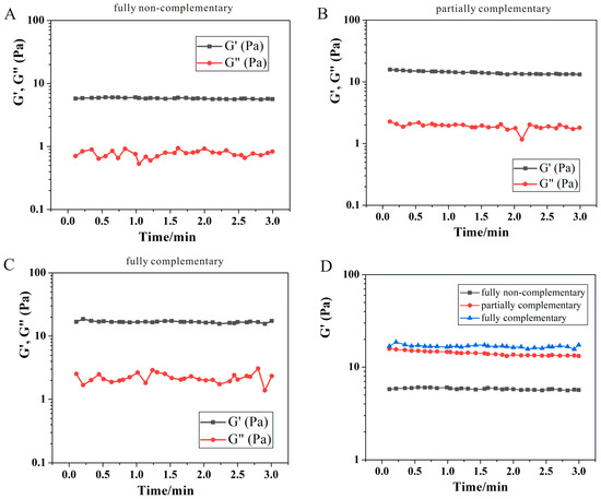 Time-scan rheological performance of DNA hydrogels prepared using assembly of ssDNAs with different degrees of hydrogen bonding. (A): DNA hydrogel-1 prepared with two completely non-complementary DNA strands (ssDNA-1 and ssDNA-2). (B): DNA hydrogel-2 prepared with two partially complementary DNA strands (ssDNA-1 and ssDNA-3). (C): DNA hydrogel-3 prepared with two fully complementary DNA strands (ssDNA-1 and ssDNA-4). (D): Comparison of the energy storage modulus (G′) of DNA hydrogels with different degrees of hydrogen bonding.