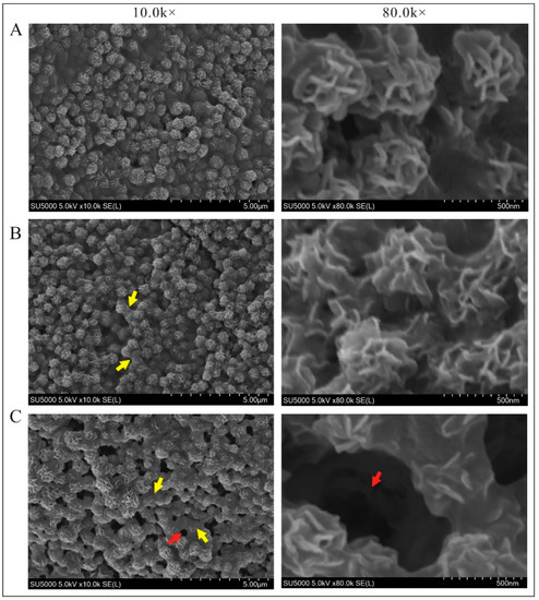 The mechanical properties of hydrogels are closely correlated with their internal microstructure. Therefore, scanning electron microscopy (SEM) was employed next to observe the microstructure of the three types of prepared DNA hydrogels. Although all three exhibited a characteristic nanoflower microstructure (Figure 4A–C) comprised of RCA-generated ssDNA and had similar diameters (~500 nm) [8], the isolated nanoflower microstructures tended to connect with each other (yellow arrows, Figure 4B,C) with an increased degree of hydrogen bonding, gradually forming a porous sheet structure (red arrows, Figure 4C). This structure was similar to the microstructure of a DNA hydrogel produced with the hybridization chain reaction (HCR) technique [45,46], which can yield double helices [47]. The results intuitively demonstrate that as the degree of hydrogen bonding increased, the DNA cross-linking points became denser, and the internal microstructure of the gel became more complex.