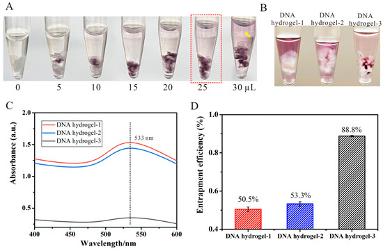 The entrapment efficiency of the DNA hydrogel based on full complementary ssDNA chains was initially assessed by examining the entrapment of varying amounts of AuNPs–BSA (0, 5, 10, 15, 20, 25, 30 μL) using seven hydrogels prepared under identical conditions. Figure 5A shows the results, whereby the supernatants of the tubes were transparent when the amount of AuNPs–BSA was less than 25 μL, indicating that most of the AuNPs were wrapped in the hydrogel. However, when the amount exceeded 25 μL, the supernatant of the tube turned red (yellow arrow, Figure 5A), indicating that a significant amount of free AuNPs–BSA remained. Therefore, 25 μL of AuNPs–BSA (dashed frame, Figure 5A) was chosen as the optimized indicator to test the entrapment ability of the different DNA hydrogels.