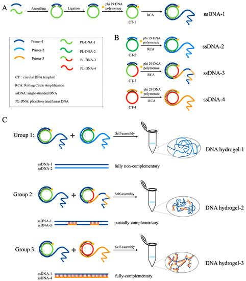 Schematic illustration of DNA hydrogels prepared using ultralong single-stranded DNA (ssDNA) with varying hydrogen bonding degrees generated with dual rolling circle amplification (RCA). (A): Preparation of circular DNA template (CT-1) and generation of ssDNA chain (ssDNA-1) by RCA reaction. (B): Generation of three ssDNA chains (ssDNA-2, ssDNA-3, and ssDNA-4) by RCA reaction based on three types of circular DNA templates (CT-2, CT-3, and CT-4). (C): Group 1 shows DNA hydrogel-1 prepared after the self-assembly of two fully non-complementary DNA strands, ssDNA-1 and ssDNA-2; group 2 shows DNA hydrogel-2 prepared after the self-assembly of two partially-complementary DNA strands, ssDNA-1 and ssDNA-3; group 3 shows DNA hydrogel-3 prepared after the self-assembly of two fully-complementary DNA strands, ssDNA-1 and ssDNA-4.