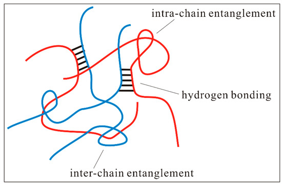 Schematic diagram of DNA hydrogels based on DNA chain entanglement (including intra- and inter-chain entanglement) and hydrogen bonding of long single-stranded DNAs.
