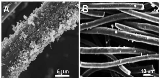 After the ultrasonication treatment of commercial CF in HNO3 (50%) for 45 min, MnCO3NS was interconnected onto the CF surface by hydrothermal process. The surface characterizations of CF and MnCO3NS were explored by SEM (Figure S1). According to Figure S1A, the diameter of the smooth carbon fiber was calculated as about 7–8 µm, and the diameter of pure MnCO3NS was obtained as about 3–4 µm (Figure S1B). After the preparation of MnCO3NS interconnected onto the CF surface by hydrothermal method, the granular CF formation occurred via MnCO3NS interconnection (Figure 1A,B). According to Figure 1, the diameter of MnCO3NS/CF was calculated to be about 9–10 µm, indicating the successful preparation of MnCO3NS on the CF surface, including interconnected interaction.