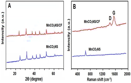 (A) XRD patterns of MnCO3NS and MnCO3NS/CF composite (Six obvious XRD peaks at 24.08°, 31.79°, 37.79°, 41.93°, 45.07° and 51.36° corresponded to (012), (104), (110), (113), and (204) planes, respectively) and (B) Raman spectra of MnCO3NS and MnCO3NS/CF composite (G band is the in-plane vibrations of sp2 hybridization of carbon atoms and D band is known as the irregularity band or the defect band).