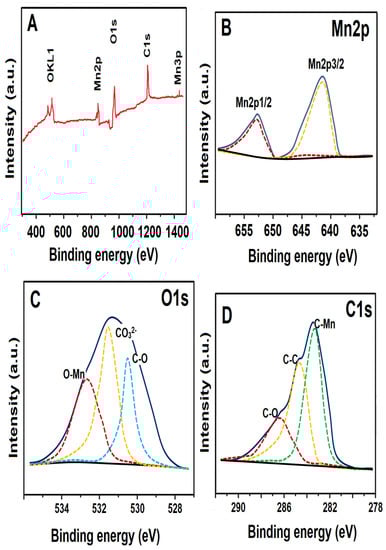 Mn2p, O1s and C1s high-resolution XPS spectrums of MnCO3NS/CF composite were given in Figure 3. According to the survey spectrum of Figure 3A, the presence of manganese, oxygen and carbon elements verified MnCO3NS/CF composite. The XPS peaks at 653.08 eV and 640.39 eV on Mn2p spectra (Figure 3B) were attributed to Mn2p1/2 and Mn2p3/2, respectively [37]. In addition, three XPS peaks at 532.71 eV, 531.09 eV and 530.46 eV corresponded to O-Mn, CO32− and C-O bonds, respectively (Figure 3C). On the C1s spectrum (Figure 3D), three XPS peaks at 286.13 eV, 284.69 eV and 283.94 eV corresponded to C-O, C-C and C-Mn, respectively. It was concluded that the C-Mn bond resulted from the interaction between MnCO3 and CF. Hence, MnCO3NS was bridged to CF via C-Mn bonds, providing chemical stability during the electrochemical sensor application [38,39].