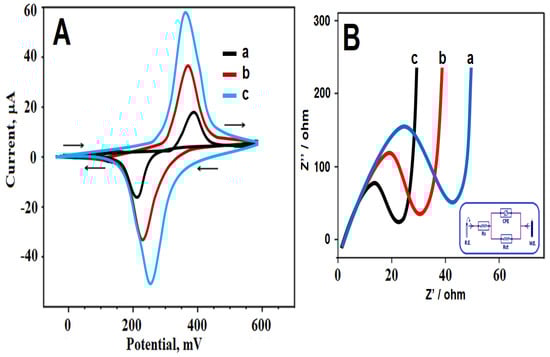 (A) CV curves (arrow indicates potential scanning direction) and (B) EIS responses at (a) bare GCE, (b) MnCO3NS/GCE, (c) MnCO3NS/CF/GCE.