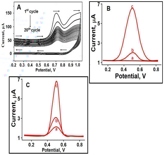 In addition, when CV anodic peak currents were plotted against the square root of the scan rate (10–1000 mV s−1) (R2 = 0.9991), the obtained linearity indicated that the oxidation phenomenon was diffusion-controlled [42].