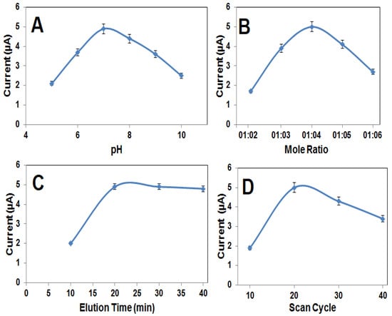 Effect of (A) pH, (B) mole ratio, (C) desorption time, (D) scan cycle on signals of DPVs (in the presence of 0.5 nmol L−1 OTA) (n = 6).