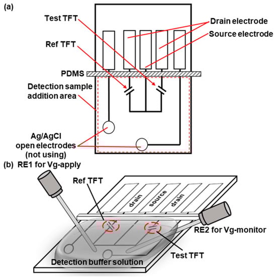 Figure 1a shows the planar structure of the TFT biosensor. The TFT biosensor consists of two TFTs. The right-side TFT, referred to as the “Test TFT”, was used for detecting samples. On this TFT, the probe DNA with the complimentary sequence to the target DNA was immobilized to be captured and detected by the TFT. The left-side TFT, referred to as the “Ref TFT”, provided a reference signal when no DNA was specifically bound to it. Therefore, a probe DNA with a sequence that is not complementary to any DNA in the samples was immobilized. Both TFTs shared a common source electrode. Two electrode patterns for Ag/AgCl open reference electrodes were fabricated on the chip for future practical use. In this study, these patterns were not employed, and more accurate reference electrodes are used as mentioned below. Polydimethylsiloxane was used to insulate the electrodes from liquid intrusion. Figure 1b shows the measurement setup for the TFT biosensor. The DNA probes were pre-immobilized on the surface of the Ref and Test TFTs. The source electrode and the two drain electrodes of the TFTs were connected to a 4156C Precision Semiconductor Parameter Analyzer (Keysight, Santa Rosa, CA, USA). A detection buffer solution was added to the “detection sample addition area”. A reference electrode (RE1) was inserted into the solution to apply the gate voltage (Vg-apply). Another standard reference electrode (RE2) was placed in the solution to monitor the actual potential (Vg monitor) applied to the solution. Subsequently, a drain voltage Vd of 200 mV was applied between the source and drain electrodes. Concurrently, a variable voltage Vg ranging from 0 to 800 mV was applied to the gate electrode RE1. The resultant currents flowing through the drains of the Ref and Test TFTs were recorded as Id. The Id–Vg curves were plotted using the Id and Vg-monitor instead of Vg-apply.
