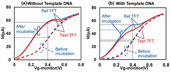 Figure 5 depicts the typical changes in the Id–Vg curve of the TFT biosensor before and after incubation with the RPA products. The products were treated with proteinase K and purified before incubation. Measurements were performed three times before and after incubation. Here, the curves represent the third measurement. In Figure 5a, the RPA reaction system did not contain template DNA (replaced with the same amount of ultrapure water), whereas in Figure 5b, the RPA reaction system contained 103 copies/μL template DNA. Figure 5a,b show that the Id value increased after incubation. However, as shown in Figure 5a, no significant difference in the Id values of the Ref and Test TFTs were found before and after incubation. By contrast, in Figure 5b, after incubation with the purified RPA samples, the Id value of the Test TFT significantly decreased compared with that of Ref TFT, especially at Vg values near 0.4 V.