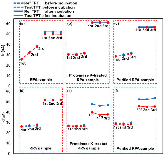 Figure 6 summarizes the change in Id at Vg = 0.4 V under the various conditions listed in Table 2. Measurements were performed three times before and after incubation under all conditions. As shown in Figure 6a–c, regardless of the type of RPA sample, no significant change in Id was found between the Ref and Test TFTs. As shown in Figure 6e–f, the Id value in the Test TFT noticeably decreased in the proteinase K-treated and purified RPA samples but did not decrease in the untreated RPA product. The magnitudes of the changes shown in Figure 6e,f were approximately equivalent. We considered that this is because of the effect of single-stranded binding proteins (SSB) in the RPA reagents. In RPA, the SSB protein binds to single-stranded DNA during the amplification process [30,31], protecting it from degradation and preventing the formation of unwanted secondary structures, thus promoting DNA amplification. The SSB protein interacts with single-stranded DNA to form a more stable protein–nucleic acid complex than DNA–DNA, protecting the single-stranded DNA and increasing amplification efficiency and accuracy. However, because of the presence of SSB, the amplified DNA may not bind well to the probes on the chip surface. Proteinase K is expected to degrade SSB proteins in the RPA samples. These results indicate that the TFT biosensor preferentially detected the RPA product, whereas the TFT responded less to the forward primer. This finding may be due to the differences in DNA length. Here, the Id values before incubation were expected to be the same because they were taken in the same condition. In fact, in Figure 6, they changed slightly mainly due to the deviation during the device fabrication process, but were almost close and this indicates a level of reproducibility of our TFT devices. For reproducibility, it is important to note the Id differences in pair of Ref TFT and Test TFT on a biosensor device. They were a few µA level and small enough differences for the above discussions.