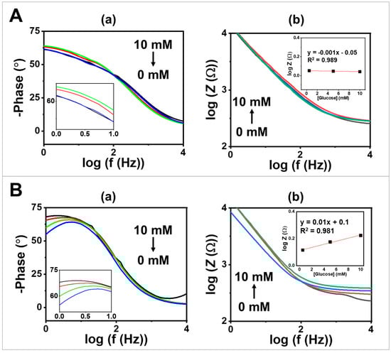 EIS studies of glucose sensor on (A) a screen-printed CNT-modified electrode compared with (B) screen-printed electrode coated with GOx/PQ/egg white protein MPs at glucose concentrations of 0, 0.5, 5, and 10 mM in 0.1 M PBS with a pH of 7.0, using a frequency range of 100–104 Hz, an amplitude of 5 mV, and 0.2 V DC; (a) phase angle vs. at frequency between 100 and 104 Hz. (b) Bode plots at frequency 100–104 Hz. The insets present a glucose calibration plot using obtained at a frequency of 104 Hz.