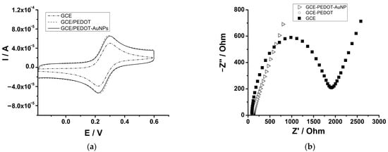 (a) CVs recorded at GCE, GCE-PEDOT, and GCE-PEDOT-AuNPs electrodes in aqueous solution containing 5 mM Na4Fe(CN)6 and 0.5 M KNO3. Potential scan rate: 50 mV/s. (b) EIS spectra recorded at GCE, GCE-PEDOT, and GCE-PEDOT-AuNPs electrodes in aqueous solution containing 5 mM [Fe(CN)6]3/4− and 0.5 M KNO3.