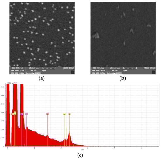 The morphological characterization of PEDOT-AuNPs composite material and PEDOT coating have been performed by using the SEM technique and the obtained data are displayed in Figure 4. The PEDOT coating displayed large grains aggregates dispersed over the surface. The SEM measurements demonstrated the presence of AuNPs in the PEDOT matrix with a mean diameter of 196.6 ± 24.5 nm. A homogeneous distribution of AuNPs over the PEDOT matrix with good control of the nanoparticles’ diameter could be observed. The EDX spectrum of the PEDOT-AuNPs composite material (Figure 4c) displays the signal specific to Au and this demonstrates the successful deposition of AuNPs by using the SC procedure. The signal related to Fe could be due to the measurements performed in ferro/ferricyanide-containing solution during the preparation of the composite material, while the signal of Al could be due to the mechanical polishing of the GC electrode substrate with alumina powder. However, these species do not influence the properties of the composite material. Considering the amounts of AuNPs and PEDOT estimated by electrical charge data, the calculated molar ratio Au:EDOT is 1:3.38, which correlates relatively well with the ratio obtained from the EDX spectral analysis, 1:4.88. The difference can be explained by the fact that the determination of the charge involved the entire surface of the electrode, while the EDX analysis was conducted on a narrow, randomly selected area. These results confirm the successful electrodeposition of AuNPs by means of the SC procedure.