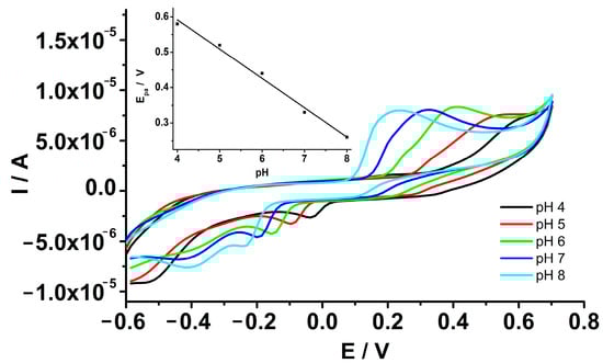 The electrochemical behavior of epinephrine was investigated at GCE-PEDOT-AuNPs based sensor by means of cyclic voltammetry technique in aqueous buffered solution. In view of the analytical applications of the proposed sensor, the behavior of epinephrine in solutions of various pH values has been studied. The influence of pH on epinephrine oxidation was estimated by cyclic voltammetry in the pH range from 4 to 8. Figure 5 shows the cyclic voltammograms recorded at the GCE-PEDOT-AuNPs sensor in an aqueous solution of various pH values. It is noted that the anodic peak potential Epa for epinephrine oxidation shifts toward less positive values with the increase in pH. The linear regression equation of the peak potential dependence on pH was as follows: Epa (V) = 0.924–0.083 pH, with correlation coefficient r = 0.9955. The slope of the Epa versus pH plot was −0.083 V/pH. The obtained slope is close to the theoretical value of −59 mV/pH for equal numbers of electrons and protons involved in the electrochemical oxidation process. According to previous results [25], the oxidation of epinephrine is a two electrons—two protons electrochemical process. The anodic peak current is almost the same for pH values from 6 to 8, while a decrease in the peak current is observed for pH values of 4 and 5. Consequently, the pH value of 7 was chosen as the optimum value for the analytical applications. This pH value is close to the value characteristic of biological real samples for potential applications in the electroanalysis of neurotransmitters.