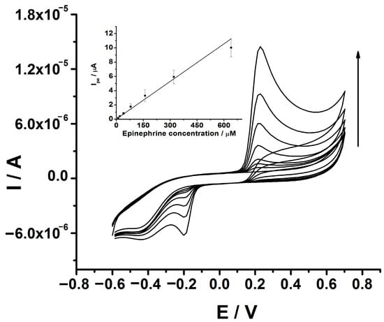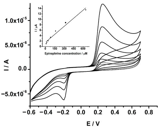 After the optimization of the pH of the solution, the analytical performance of the GCE-PEDOT-AuNPs sensor was estimated in terms of linear response range, sensitivity, limits of detection and quantification, repeatability, and reproducibility. The best analytical response was obtained after a preconcentration step with a duration of 60 s at open circuit potential in the presence of 80 μM epinephrine. In Figure 6, the CV traces recorded at GCE-PEDOT-AuNPs modified electrode in an aqueous buffered solution of pH 7 containing various amounts of epinephrine are depicted. The oxidation of epinephrine takes place at a potential value of 0.24 V vs. Ag/AgCl/KCl (3M). On the cathodic scan, a reduction wave with a peak potential value of (−0.20) V vs. Ag/AgCl/KCl (3M) could be observed. This behavior is characteristic of the catechol moiety of the epinephrine. The anodic peak current increases linearly with the epinephrine concentration in the range of 10 to 640 μM.