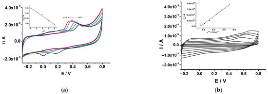 The electrochemical detection of serotonin has been investigated at the GCE-PEDOT-AuNPs-based sensor by cyclic voltammetry in an aqueous buffered solution of pH 7. The optimization of the proposed sensor has been performed taking into account the influence of pH on serotonin detection. The influence of pH on the oxidation of serotonin has been studied by cyclic voltammetry in aqueous solutions in the pH range from 4 to 8. The cyclic voltammograms recorded at the GCE-PEDOT-AuNPs sensor in an aqueous solution of various pH values and fixed serotonin concentrations are depicted in Figure 8a. The anodic peak potential Epa for serotonin oxidation negatively shifts with the increase in pH (see Figure 8a). The linear regression equation was: Epa (V) = 0.62–0.033 pH, with correlation coefficient r = 0.9931. The slope of the Epa versus pH plot was −33 mV/pH unit attesting to the two electrons and one proton oxidation process [28]. The anodic peak current of serotonin oxidation is the largest for a pH of 7. Therefore, the pH value of 7 has been used in the analytical applications and the estimation of the overall analytical performance of the proposed sensor.