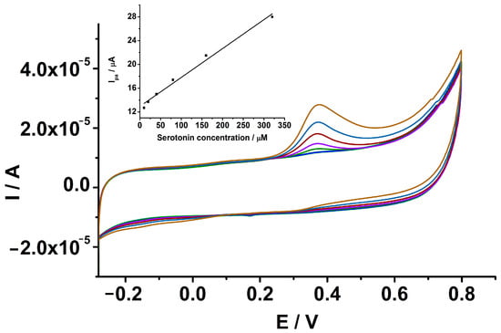 The analytical response of the GCE-PEDOT-AuNPs-based sensor towards serotonin was investigated. There was a linear increase in the anodic peak current due to the serotonin oxidation with the concentration in the range from 10 to 320 μM (see Figure 9). The linear regression equation was the following: Ipa (μA) = 12.9 + 0.049 [SER] (μM), with correlation coefficient r = 0.9947. From the slope of the calibration plot, the sensitivity of the sensor has been estimated and a value of 0.049 μA/μM has been obtained. The detection and quantification limits have been estimated. A detection limit value of 5.7 μM and a quantification limit value of 18.8 μM serotonin have been obtained, respectively. The repeatability of the proposed sensor has been estimated by measuring three times a serotonin concentration of 320 μM and was expressed as relative standard deviation (RSD%). In this case, a value of 7.2% has been obtained. The reproducibility has been also estimated by measuring the same serotonin concentration with three sensors prepared in similar conditions and a value of 8.9% has been obtained.