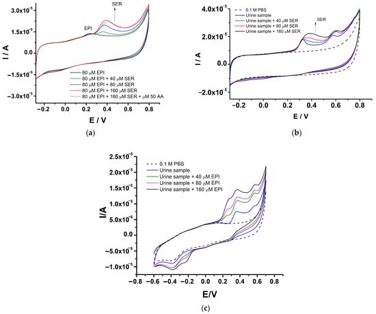 (a) CVs recorded at GCE-PEDOT-AuNPs sensor in 0.1 M PBS of pH 7 containing 80 μM epinephrine in the presence of various amounts of serotonin of 40, 80, and 160 μM. Potential scan rate: 50 mV/s. (b) CVs recorded at GCE-PEDOT-AuNPs sensor in urine samples spiked with various amounts of 40, 80, and 160 μM serotonin. Potential scan rate: 50 mV/s. (c) CVs recorded at GCE-PEDOT-AuNPs sensor in urine samples spiked with various amounts of 40, 80, and 160 μM epinephrine. Potential scan rate: 50 mV/s.